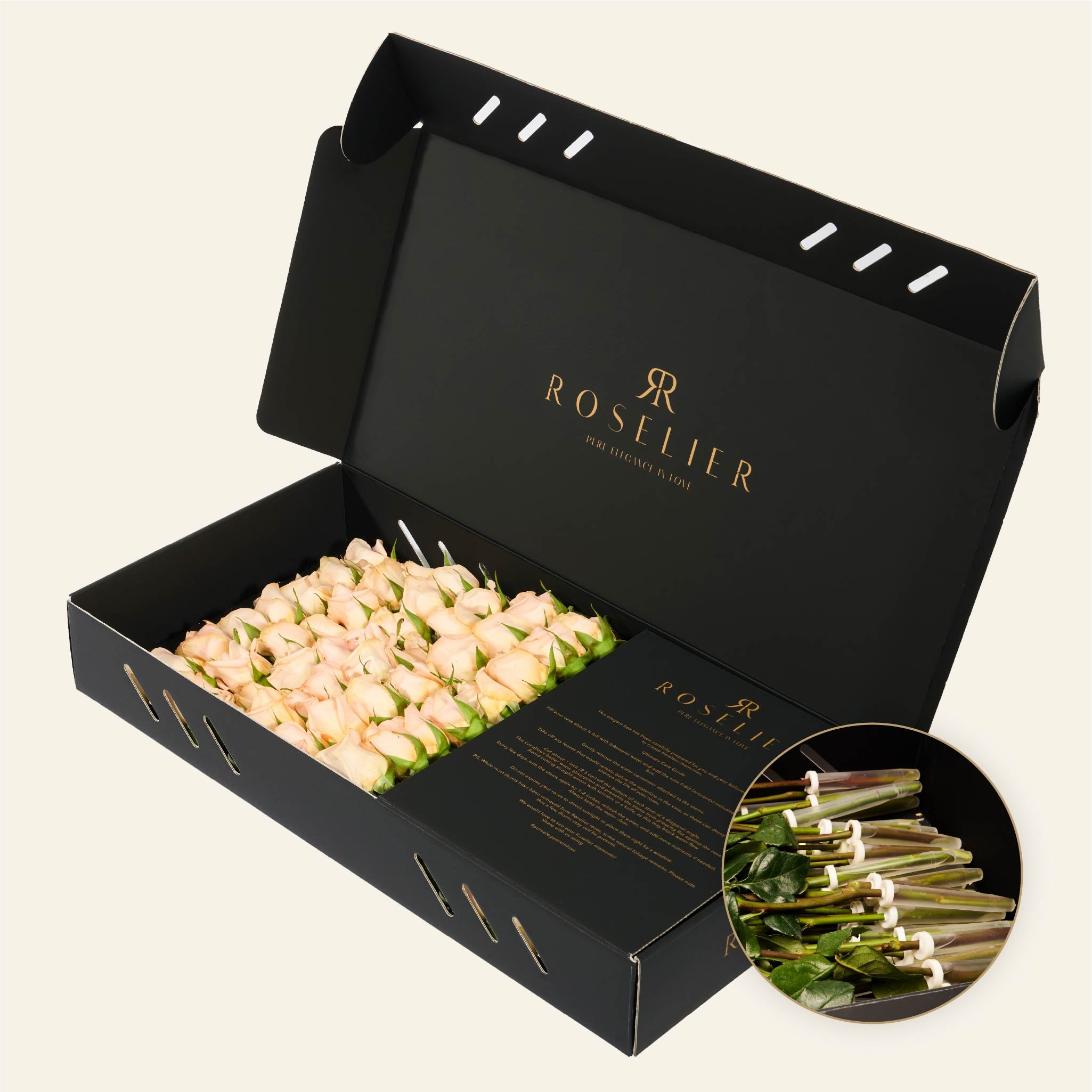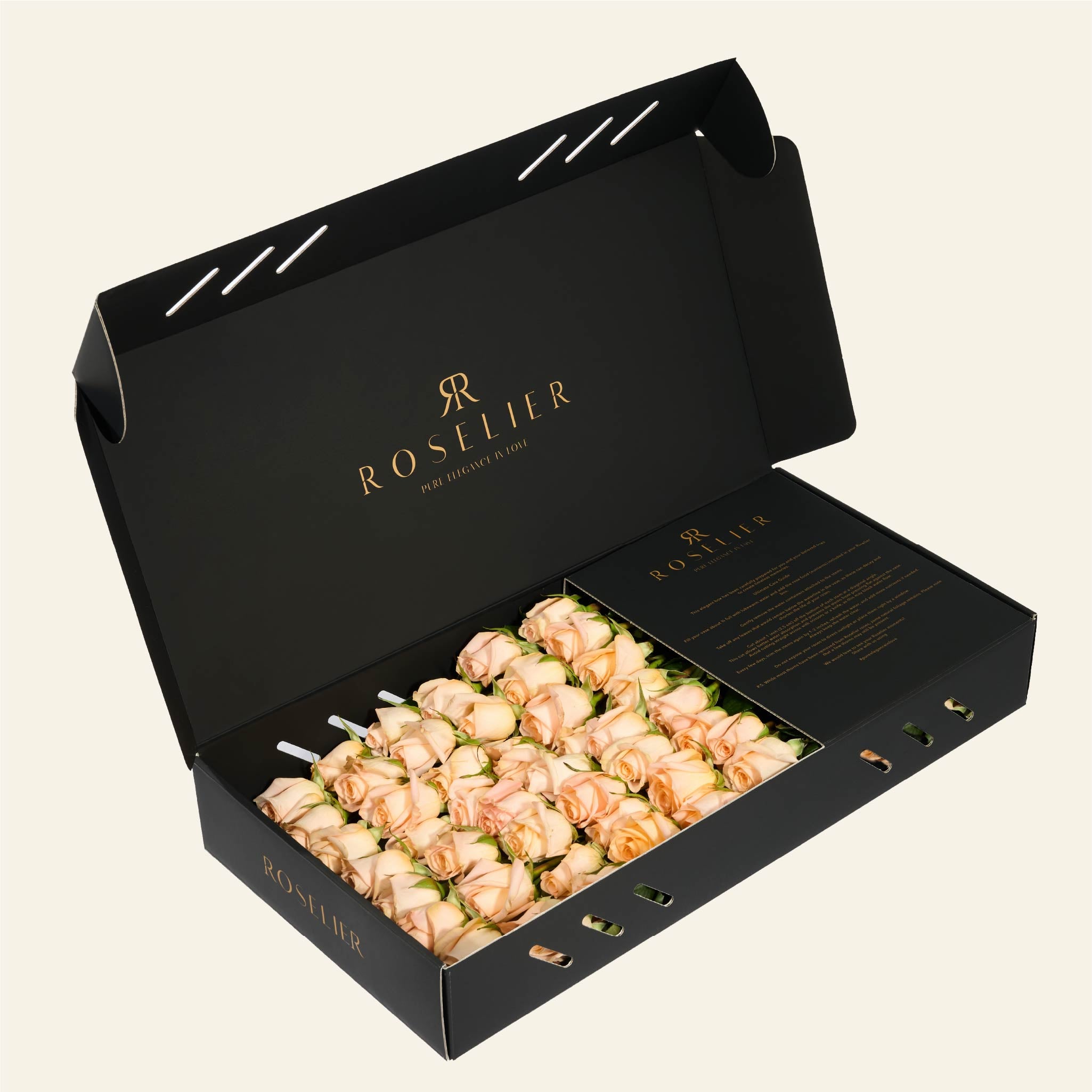 La box contiene in media 40 rose. A causa delle variazioni stagionali nella dimensione delle rose, il numero di fiori per fila può variare di ±1 rosa.