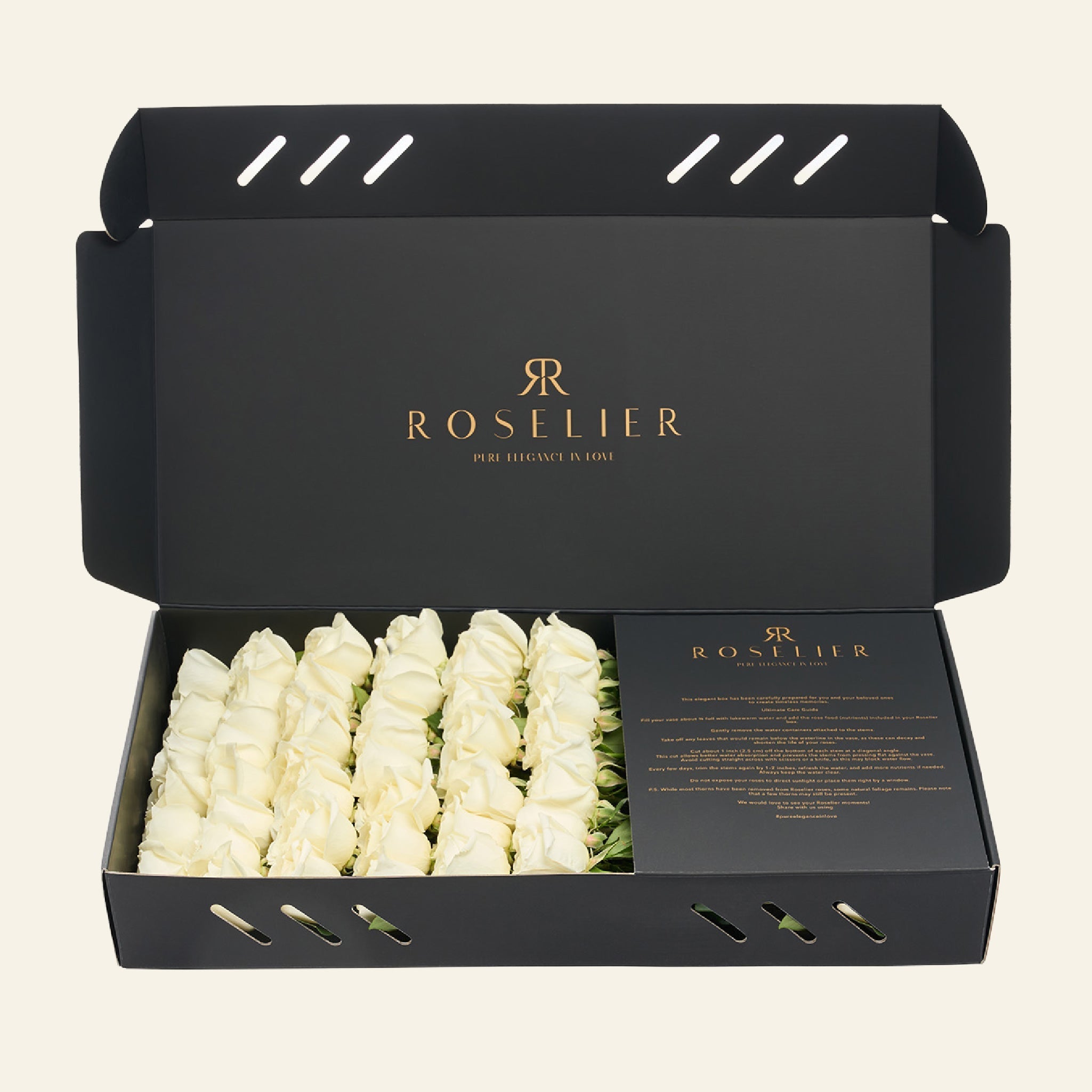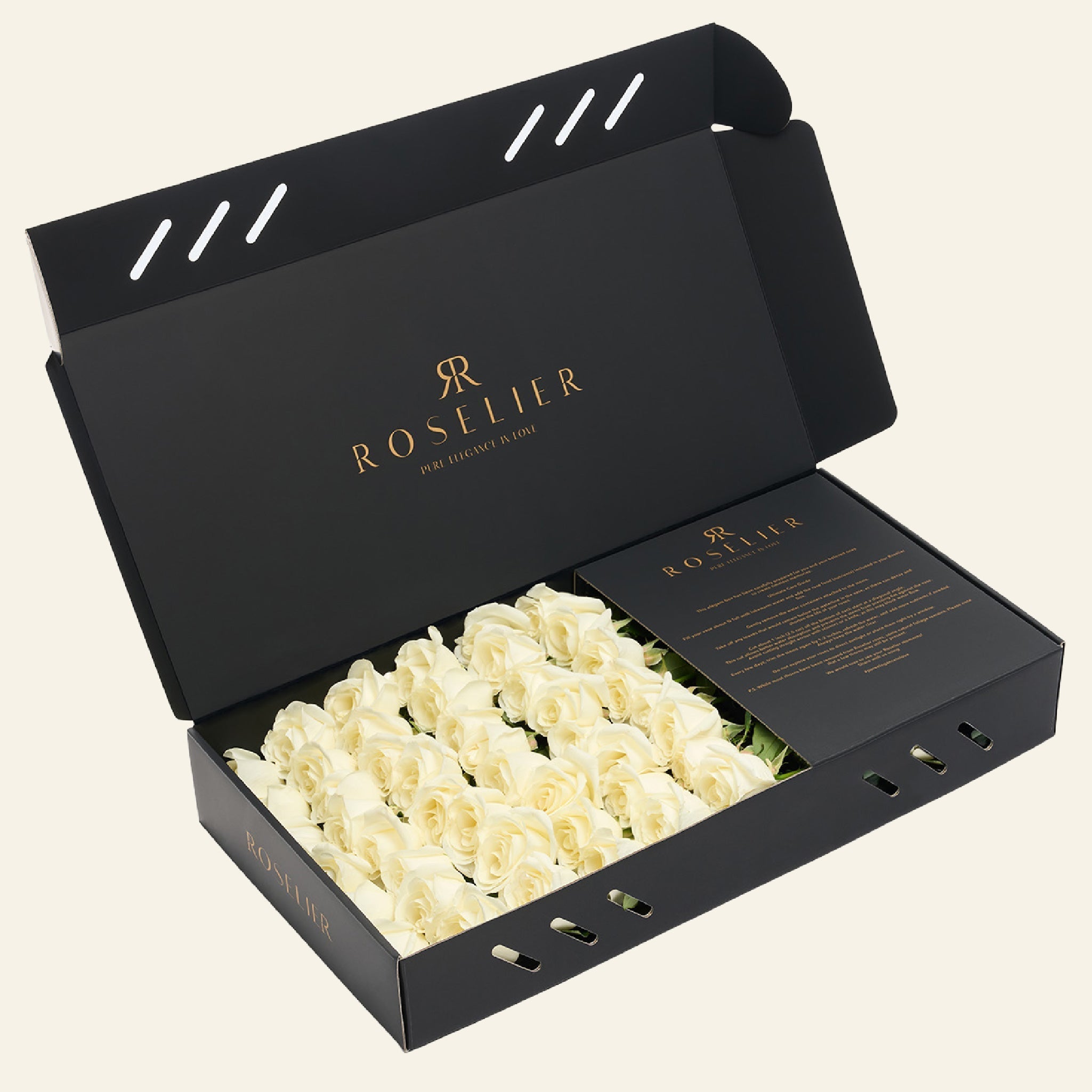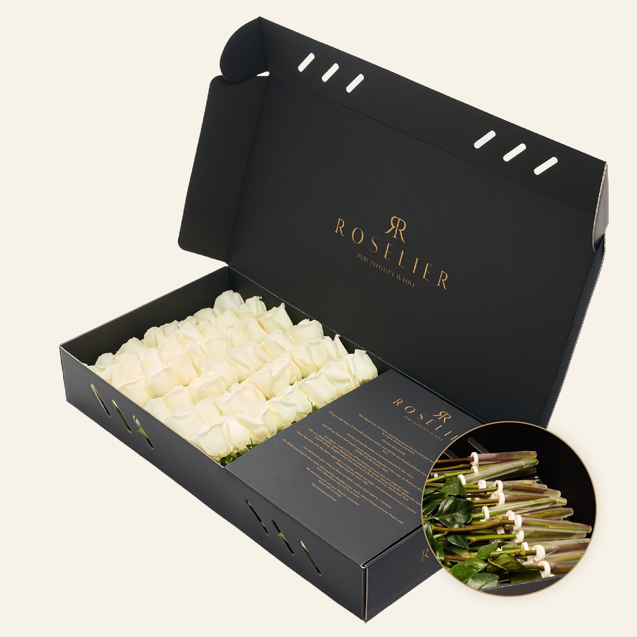 La box contiene in media 40 rose. A causa delle variazioni stagionali nella dimensione delle rose, il numero di fiori per fila può variare di ±1 rosa.
