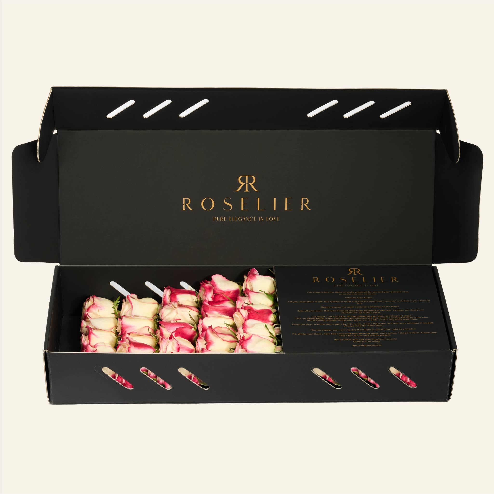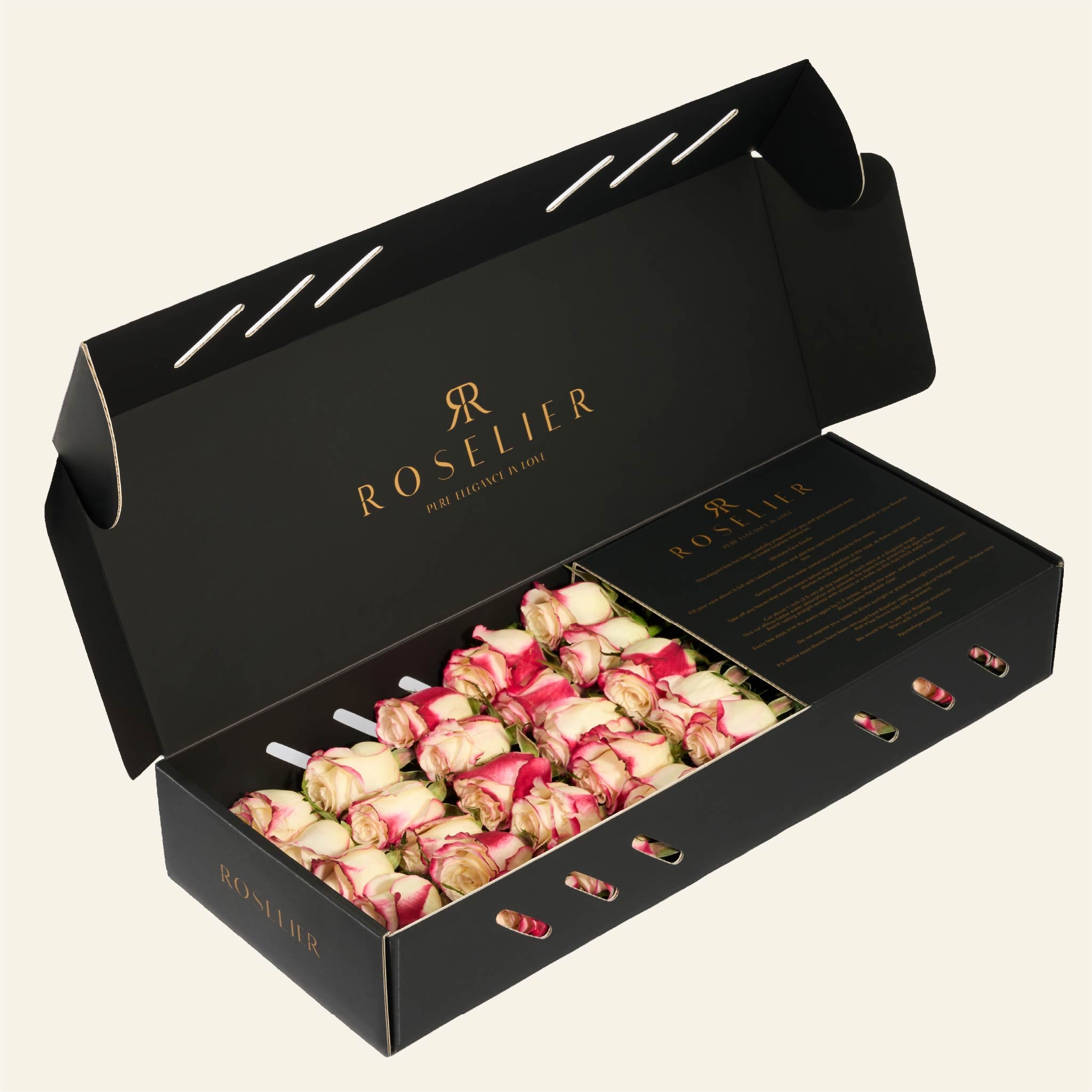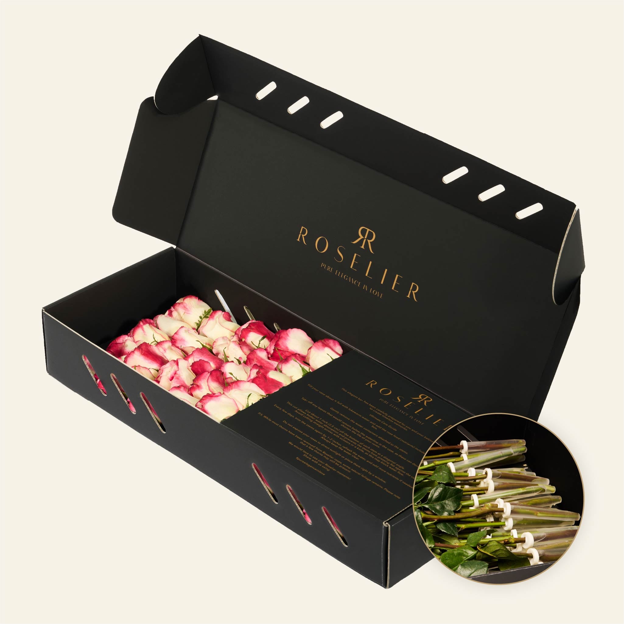 La box contiene in media 25 rose. A causa delle variazioni stagionali nella dimensione delle rose, il numero di fiori per fila può variare di ±1 rosa.