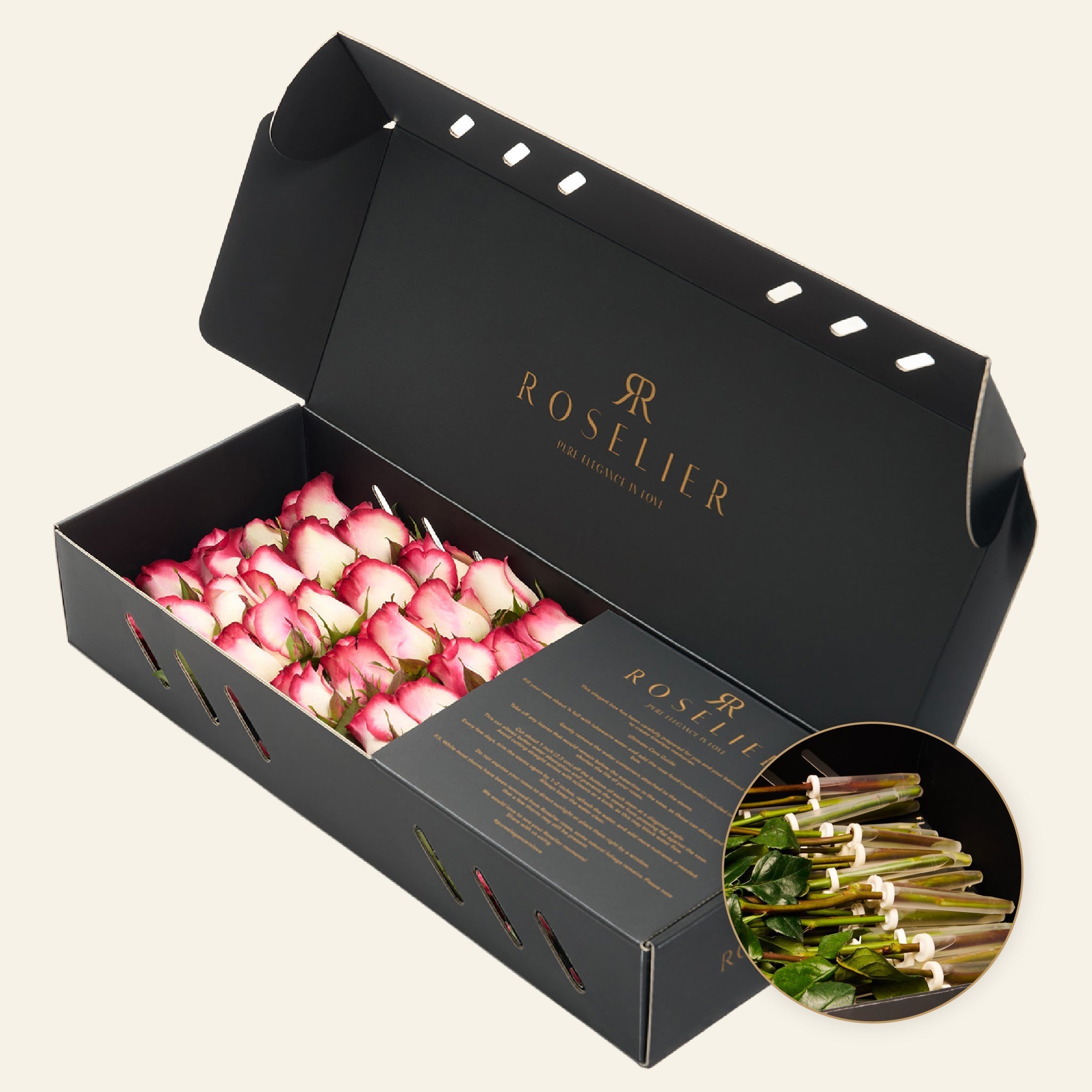 La box contiene in media 25 rose. A causa delle variazioni stagionali nella dimensione delle rose, il numero di fiori per fila può variare di ±1 rosa.