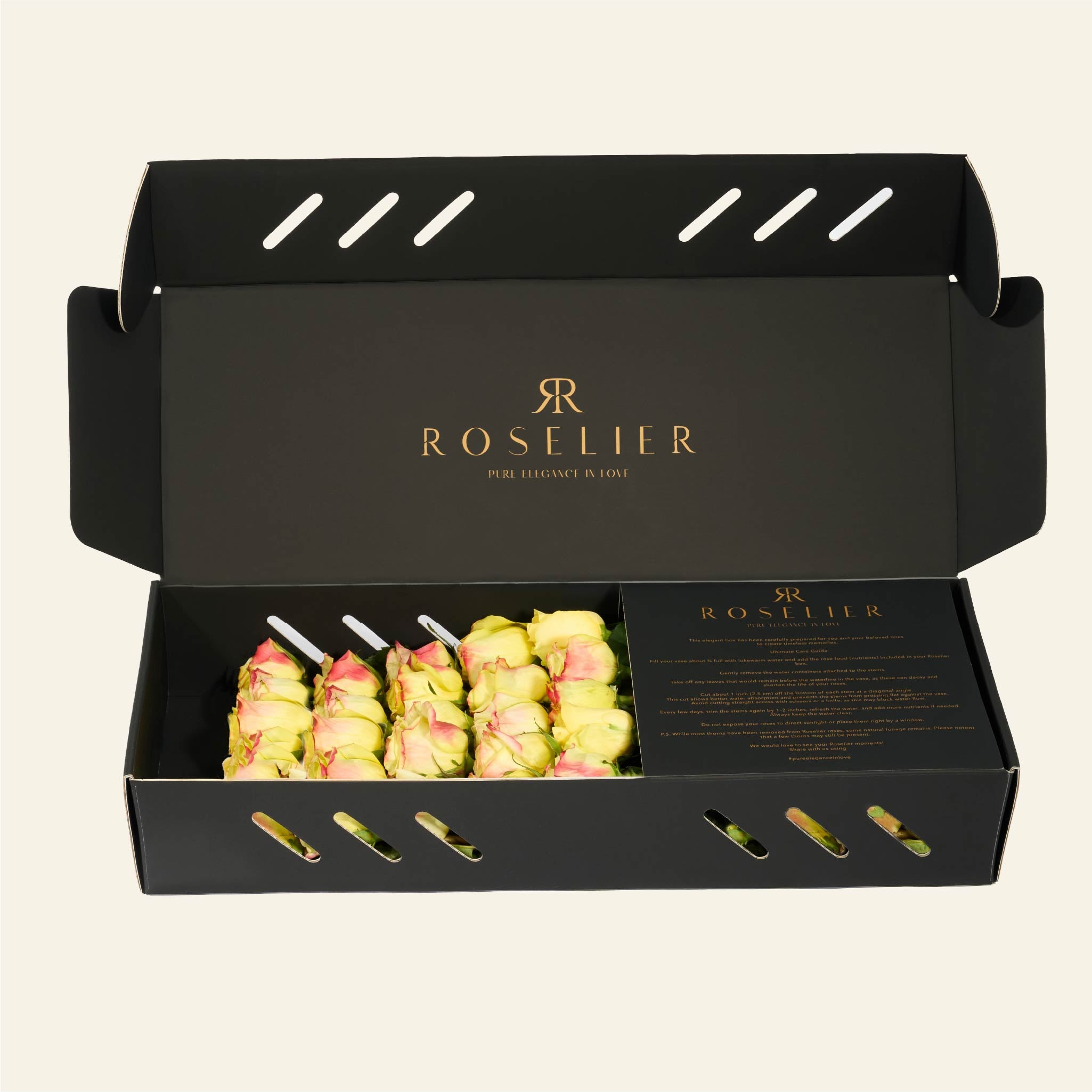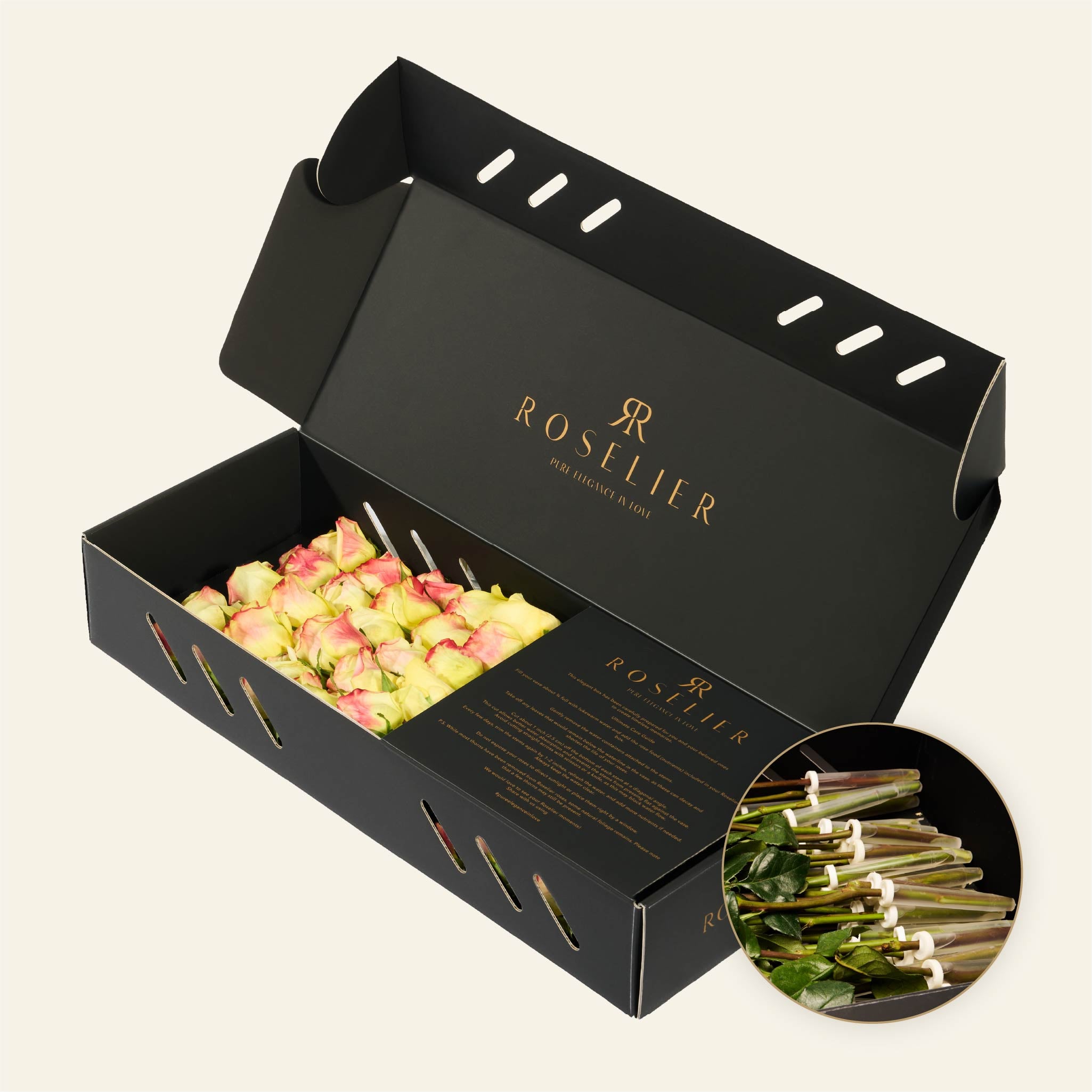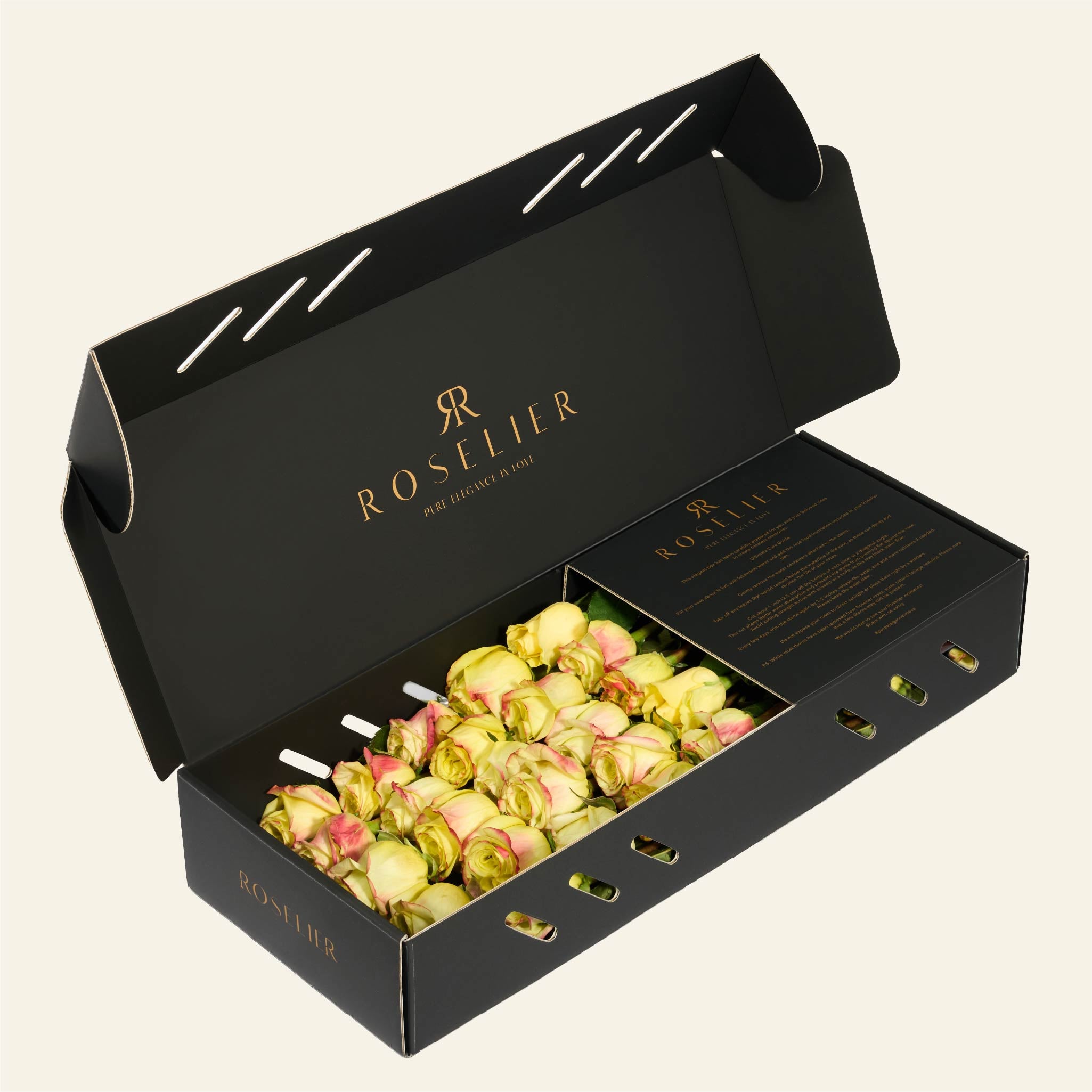La box contiene in media 25 rose. A causa delle variazioni stagionali nella dimensione delle rose, il numero di fiori per fila può variare di ±1 rosa.