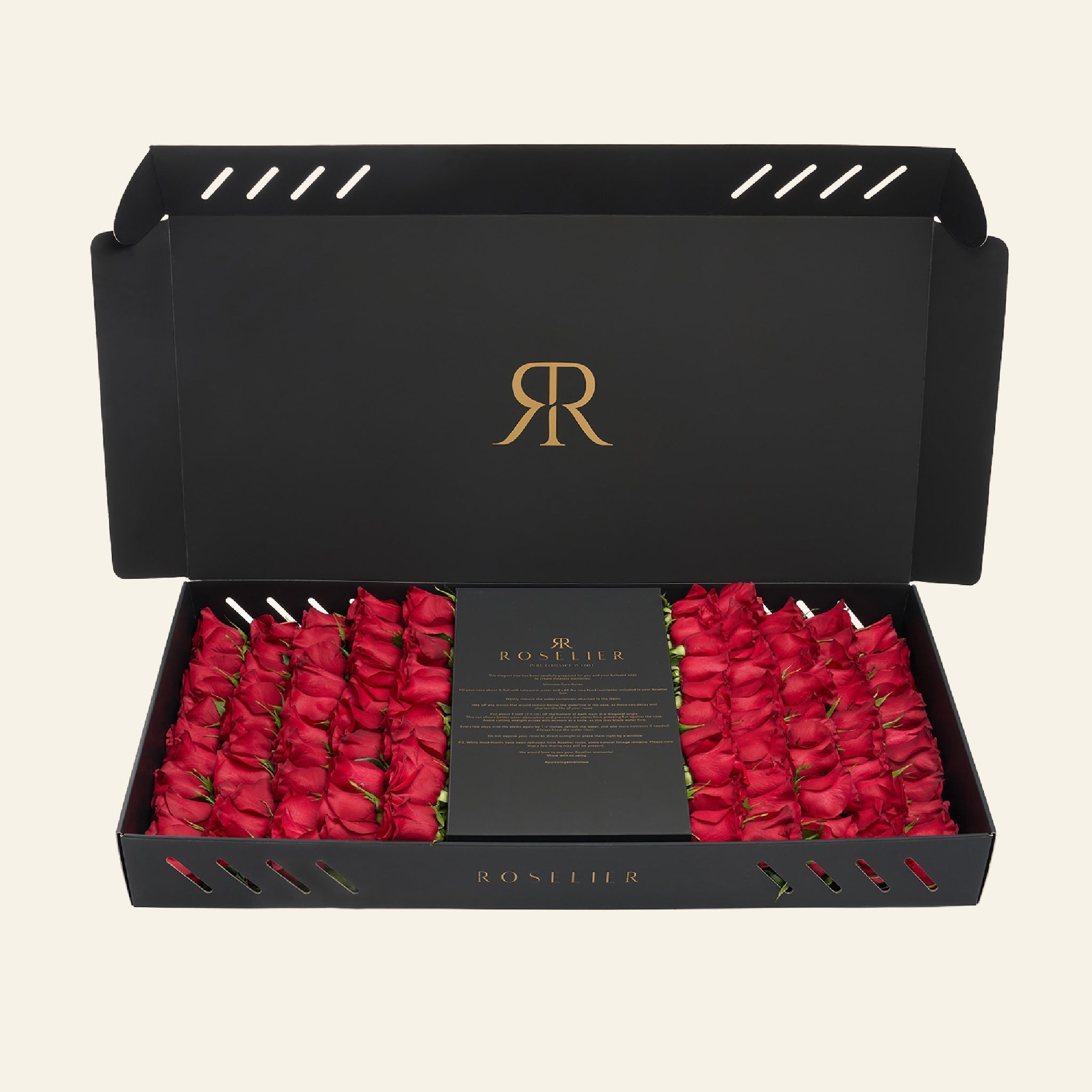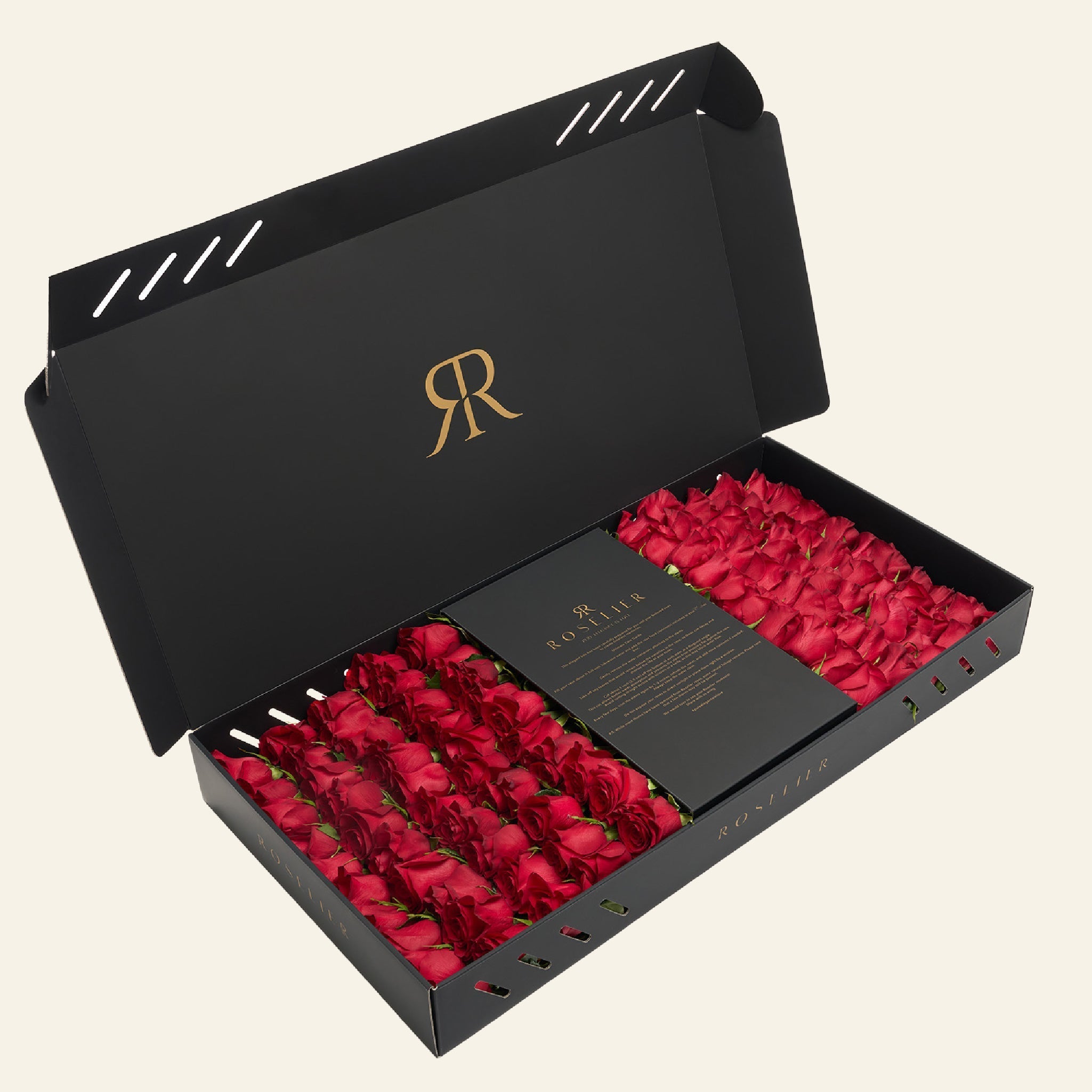 La box contiene circa 101 rose. A causa delle variazioni stagionali nella dimensione delle rose, il numero di fiori per fila può variare di ±1 rosa.