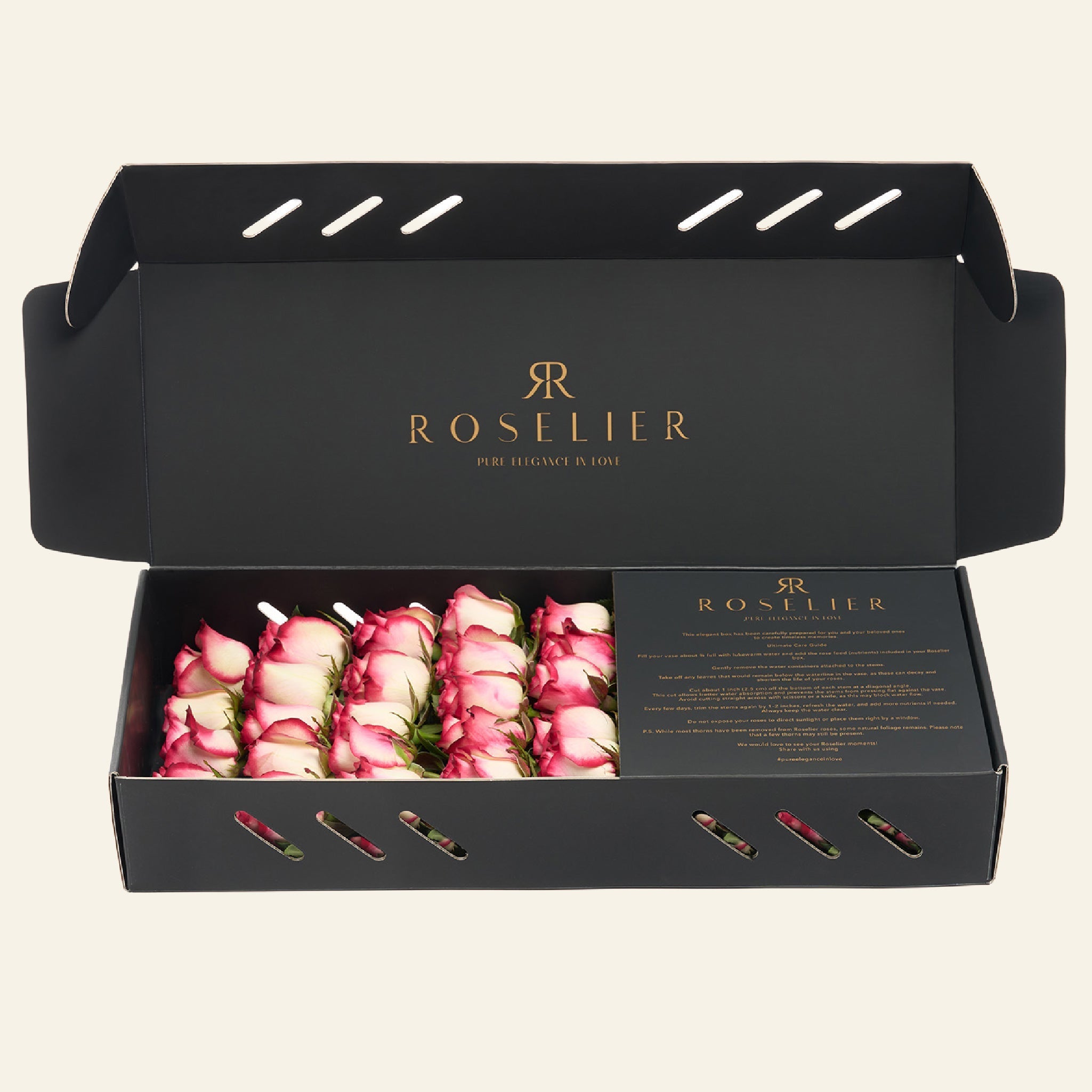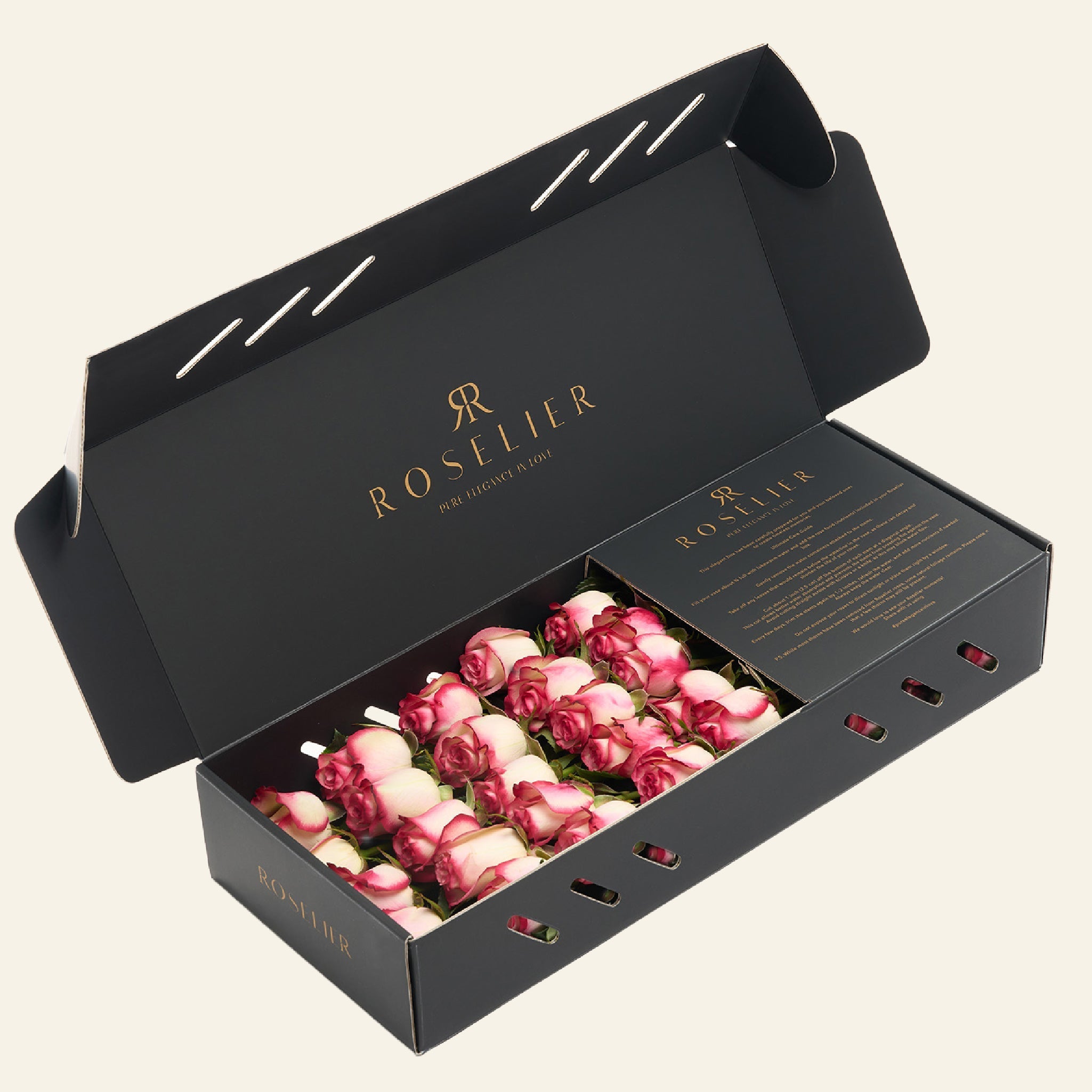 La box contiene in media 20 rose. A causa delle variazioni stagionali nella dimensione delle rose, il numero di fiori per fila può variare di ±1 rosa.