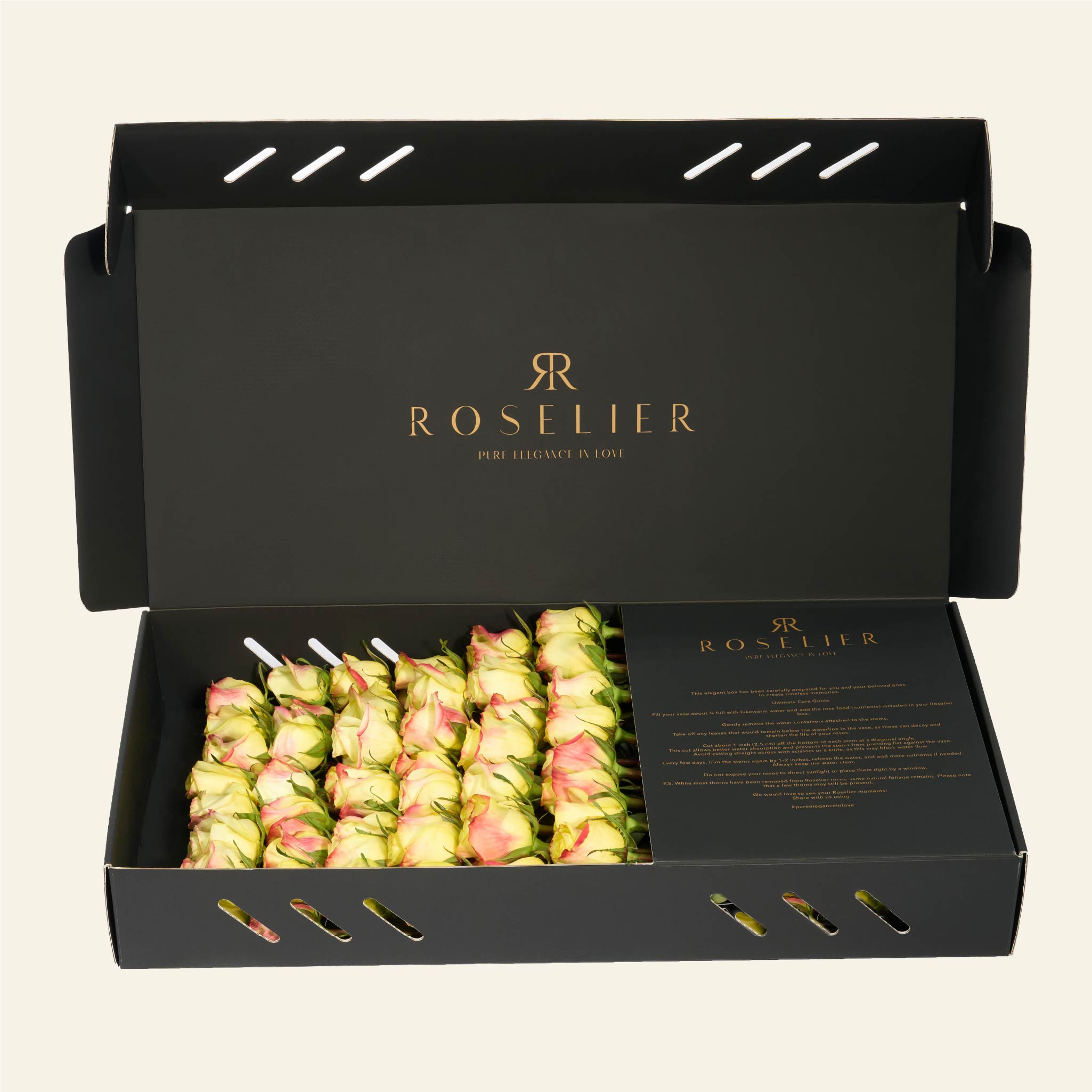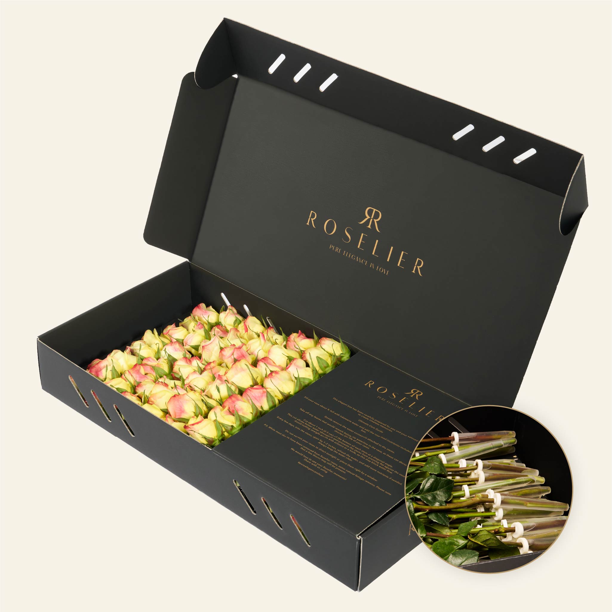 La box contiene in media 40 rose. A causa delle variazioni stagionali nella dimensione delle rose, il numero di fiori per fila può variare di ±1 rosa.