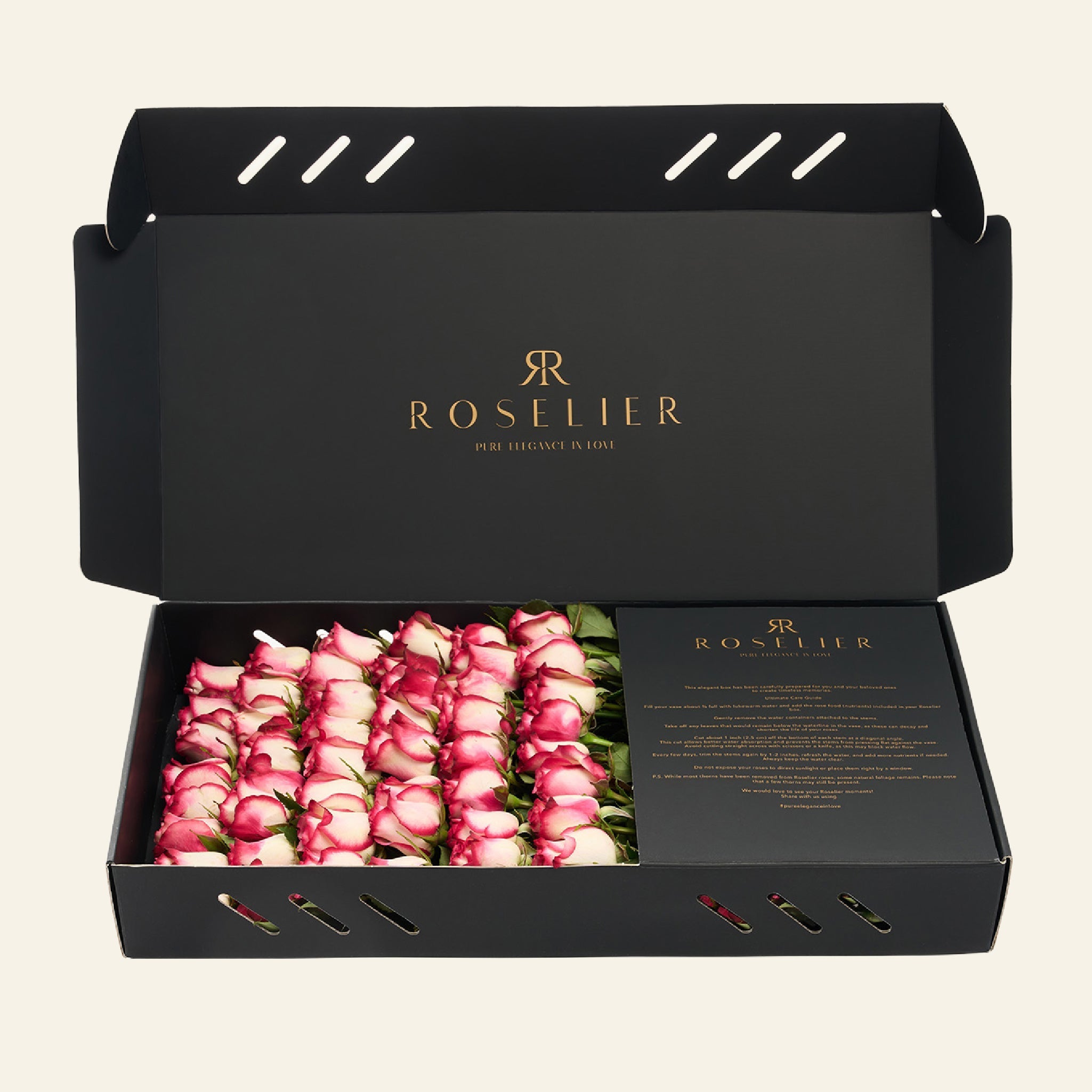 La box contiene in media 40 rose. A causa delle variazioni stagionali nella dimensione delle rose, il numero di fiori per fila può variare di ±1 rosa.